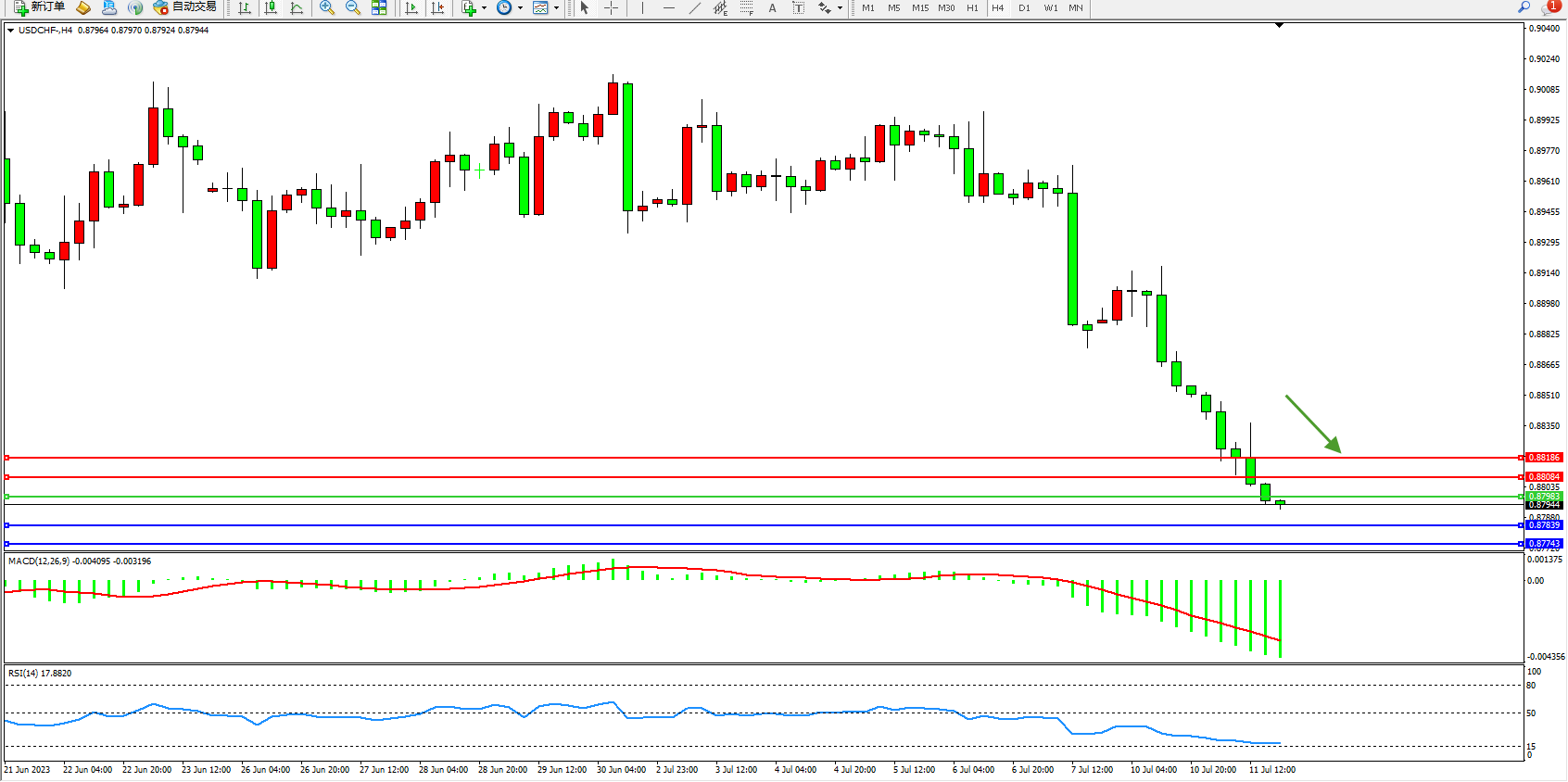 美元瑞郎USDCHF——4小时K线图显示: