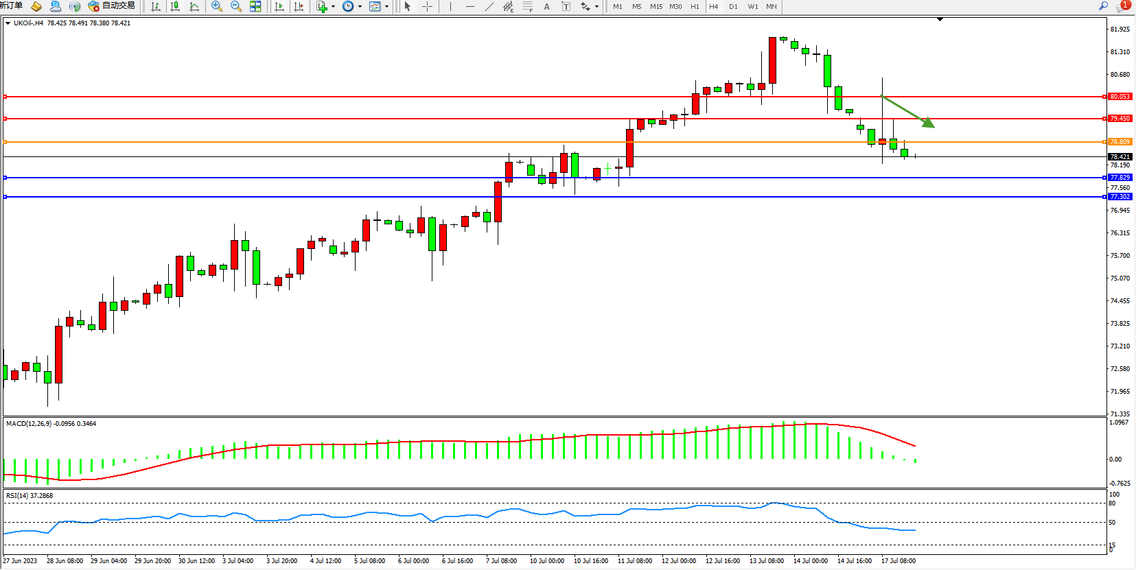 交易策略:78.809下方看跌,目标77.829  77.302