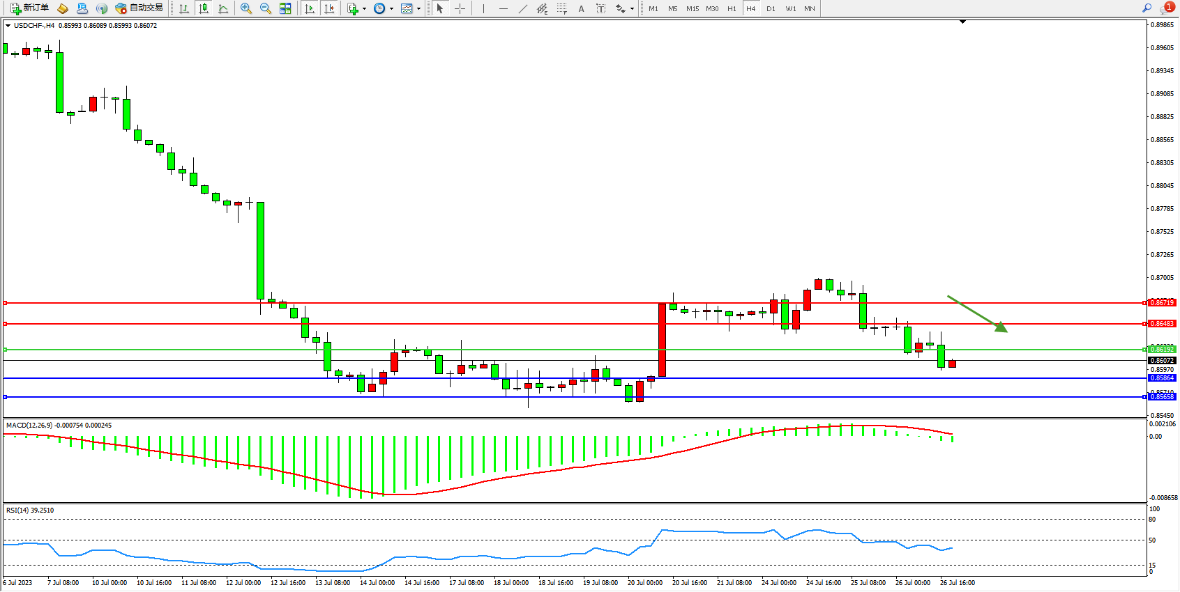美元瑞郎USDCHF——4小时K线图显示:
