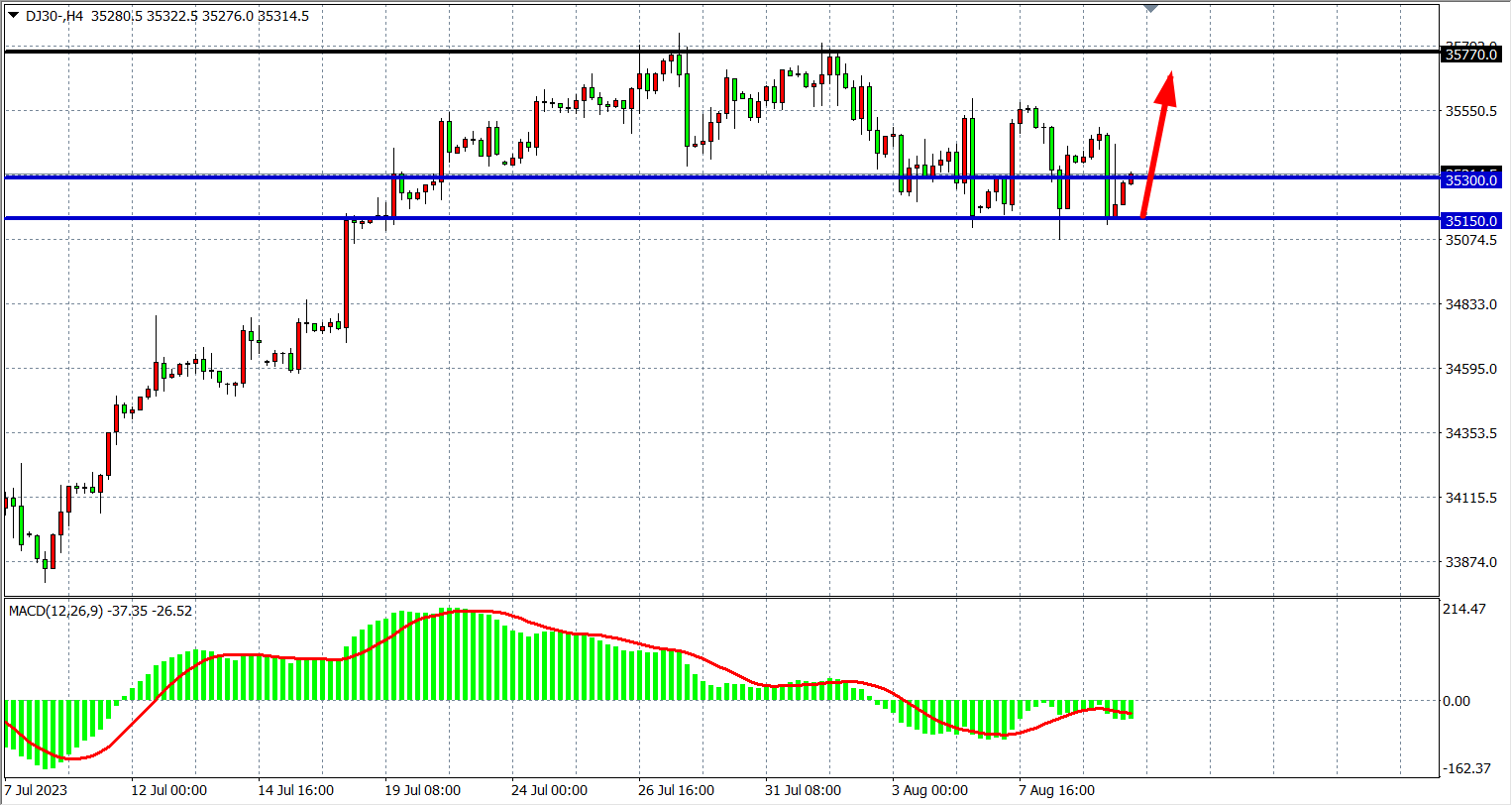 4小时图看,道指在35150附近受支撑反弹,MACD在零轴下缩量,行情继续维持高位整理,支撑关注35150-35300,阻力关注35770。
