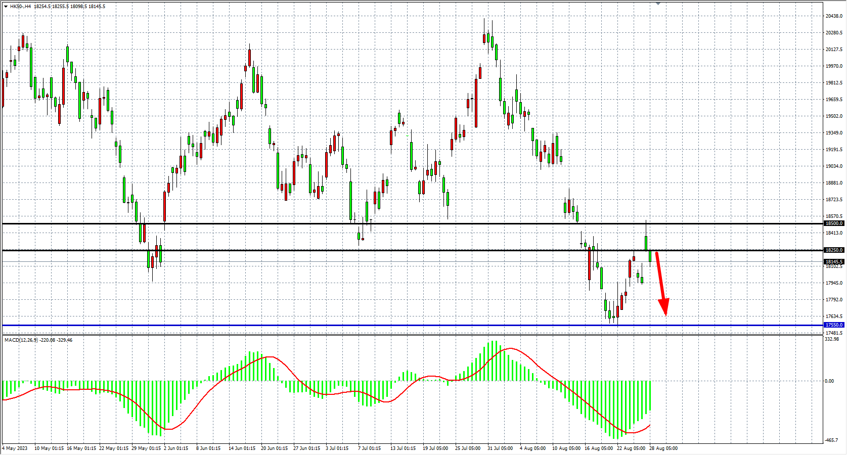 4小时图看,恒指高开低走,反弹18500附近受阻回落,MACD量能于零轴下方有所缩减,趋势维持下跌,阻力关注18250-18500,下方支撑看17550-17200。