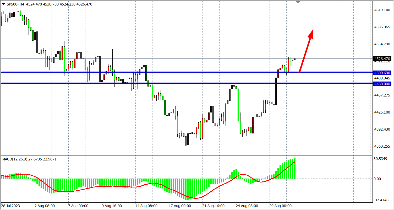 4小时图看,标普在4500之上继续走高,MACD量能在零轴上继续放大,行情延续多头,支撑关注450-44800附近,上方阻力看4550-4580。