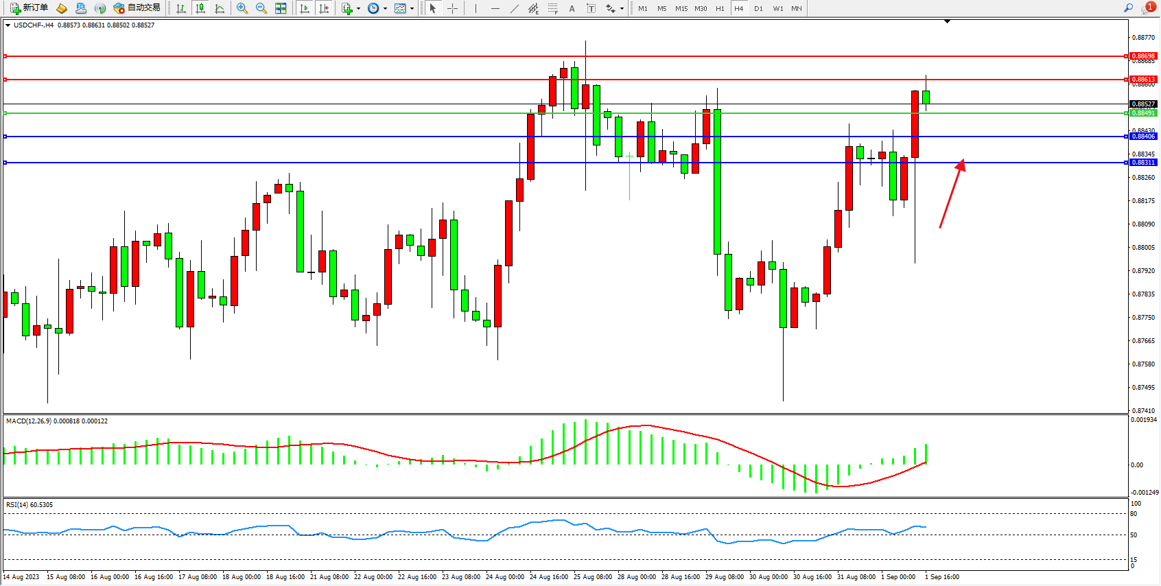 美元瑞郎USDCHF——4小时K线图显示: