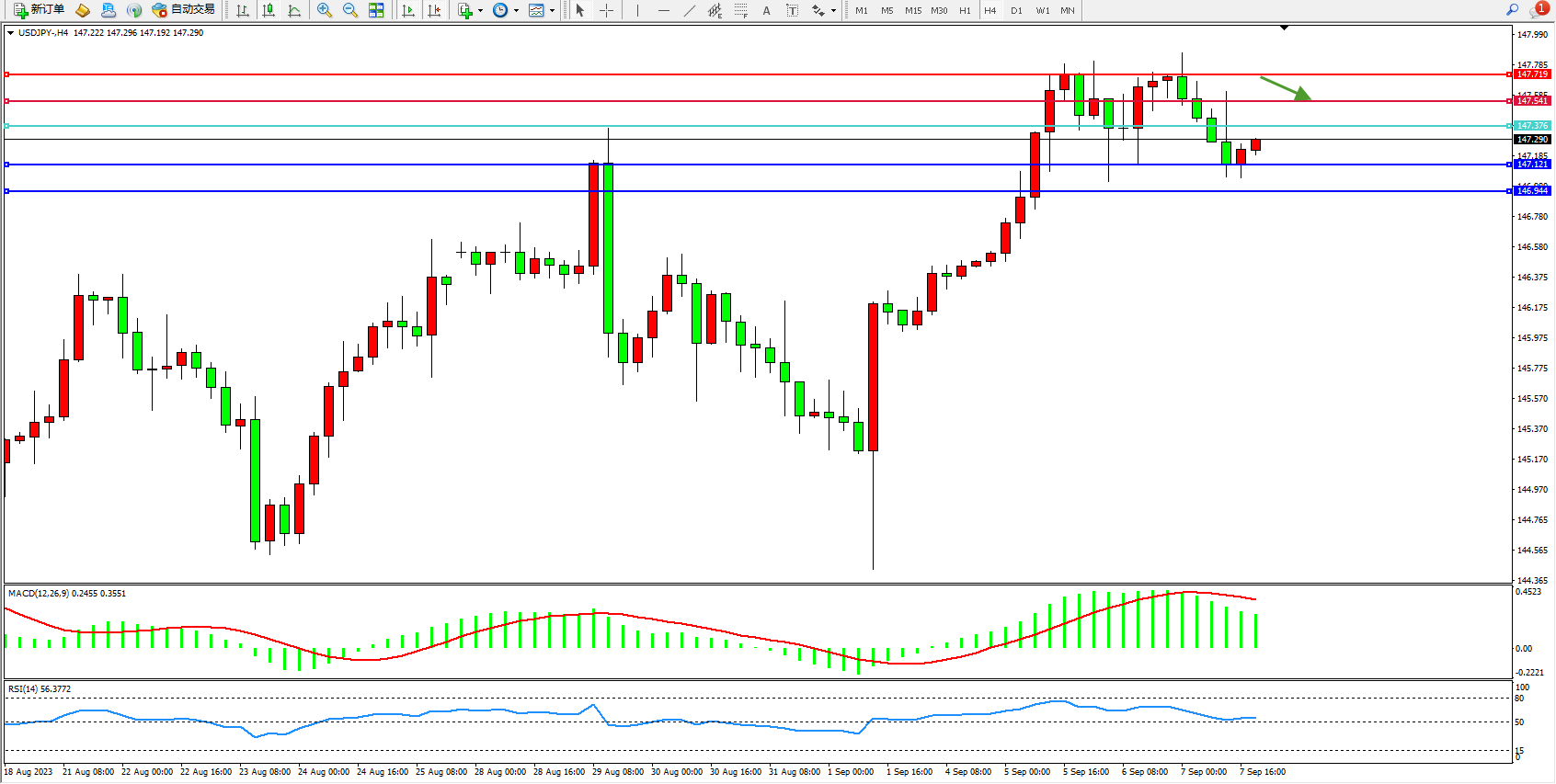 备选策略:147.376上方看涨,目标147.541 147.719