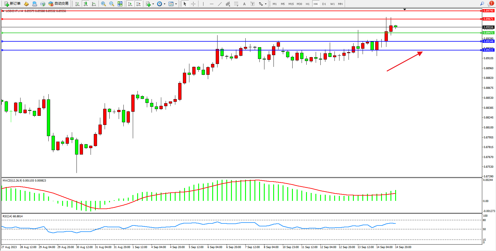美元瑞郎USDCHF——4小时K线图显示: