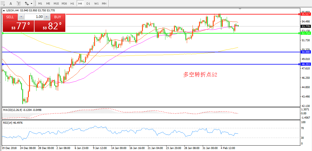 4小时图看,油价触碰55美金后回落整理,目前险守于55均线的附近, MACD红柱缩减,RSI拐头向下,日内重点关注52一线支撑。