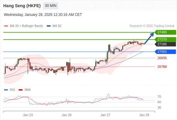 在 27050 之上,看涨,目标价位为 27270 ,然后为 27400 。