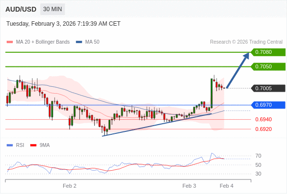 在 0.6970 之上,看涨,目标价位为 0.7050 ,然后为 0.7080 。