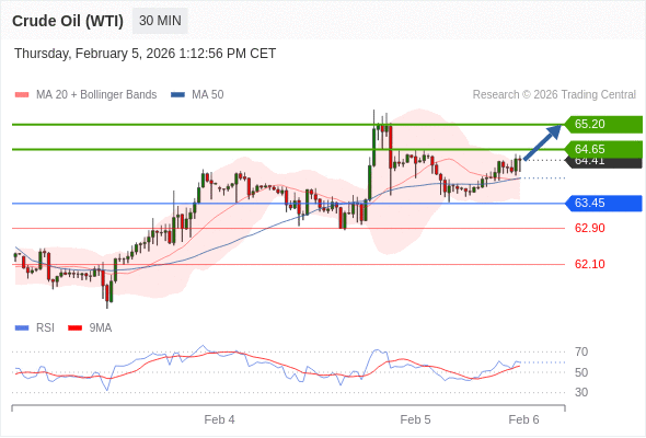在 63.45 之上,看涨,目标价位为 64.65 ,然后为 65.20 。