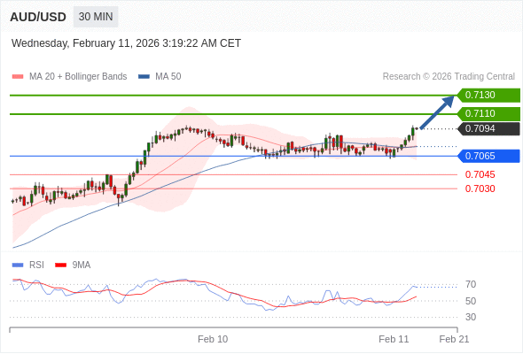 在 0.7065 之上,看涨,目标价位为 0.7110 ,然后为 0.7130 。