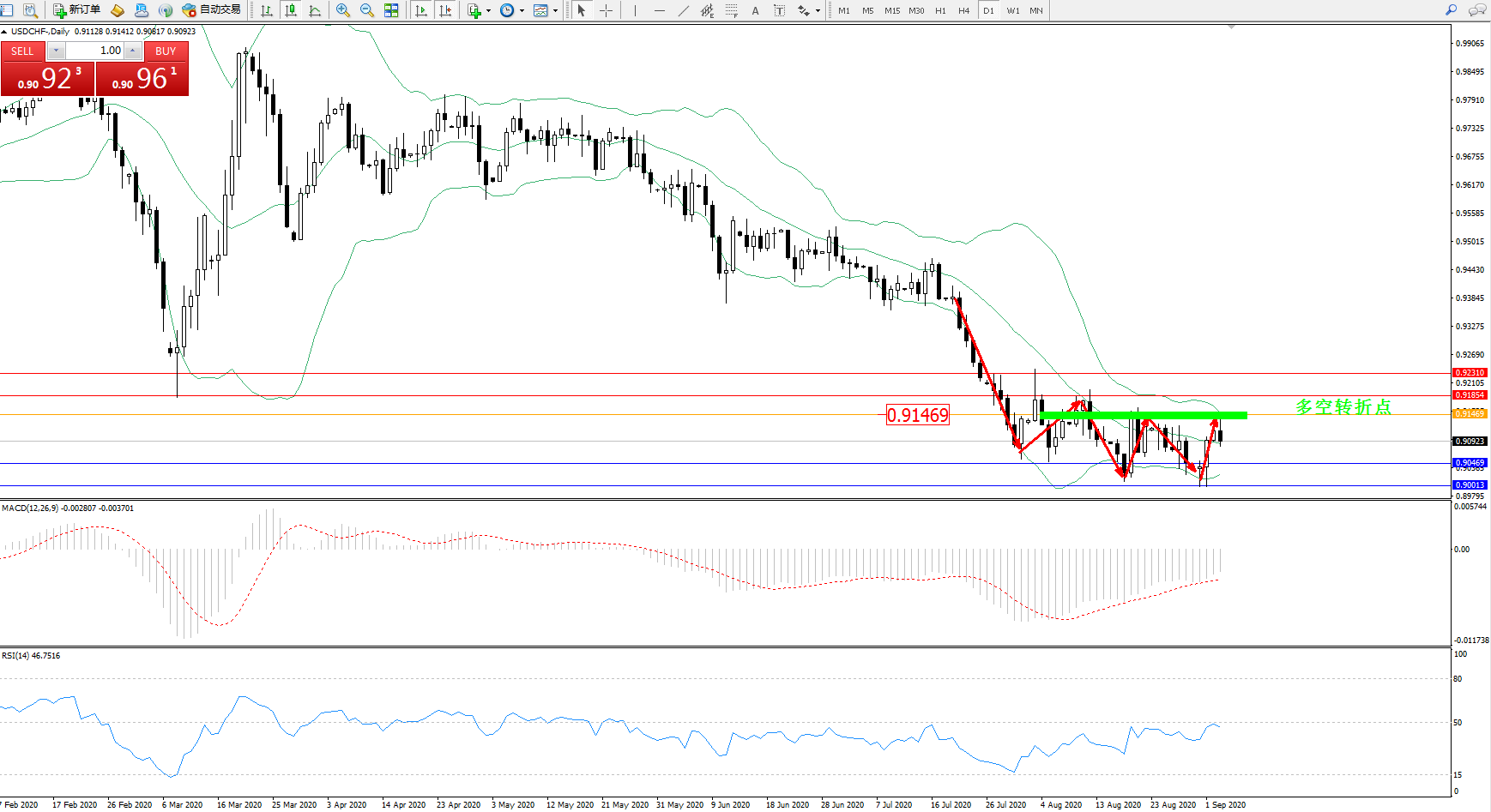 交易策略:0.91469下方看跌,目标0.90469、0.90013