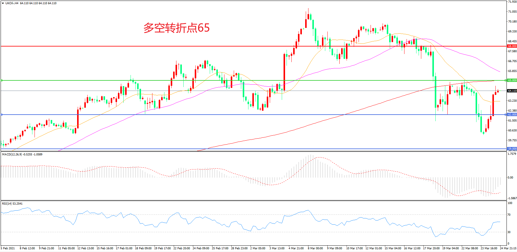 4小时图看,油价长阴下破后探底回升,短期行情有所企稳,65美元成为上行阻力,21周期均线形成短线支撑,MACD绿柱缩短,RSI指标走平,日内延续震荡概率较大。