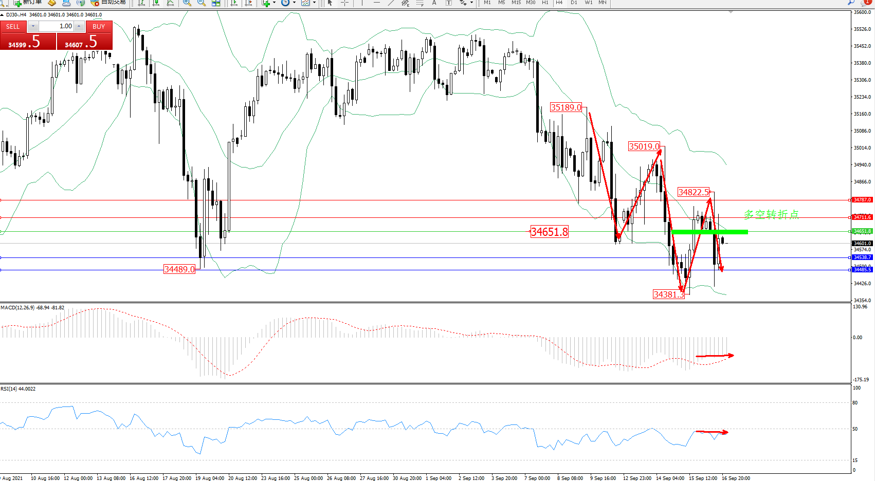 技术点评:空头动力延续布林带指标通道中下轨区间呈宽幅震荡向下移动走势中,低位34381位置虽得到短期支撑后震荡回升,但依旧维持在中下轨区间巨震,短期或处于低位宽幅整理,布林带指标呈下行趋势走势持续,MACD指标处于空头区域维持整理平移,RSI指标处于50均衡线下方维持弱势徘徊中;