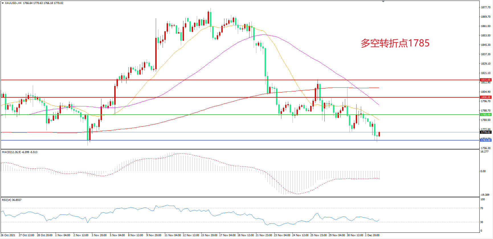 周四(12月2日),在美联储主席鲍威尔释放鹰派的信号后,市场担心美联储在加快缩减购债之外,还有可能提前加息,投资者谨慎的态度导致金价持续承压,现货黄金跌逾1%后,收报1768.34美元/盎司。今晚市场将迎来最重磅的非农就业数据,如果非农数据表现惊艳,可能导致金价进一步下行。