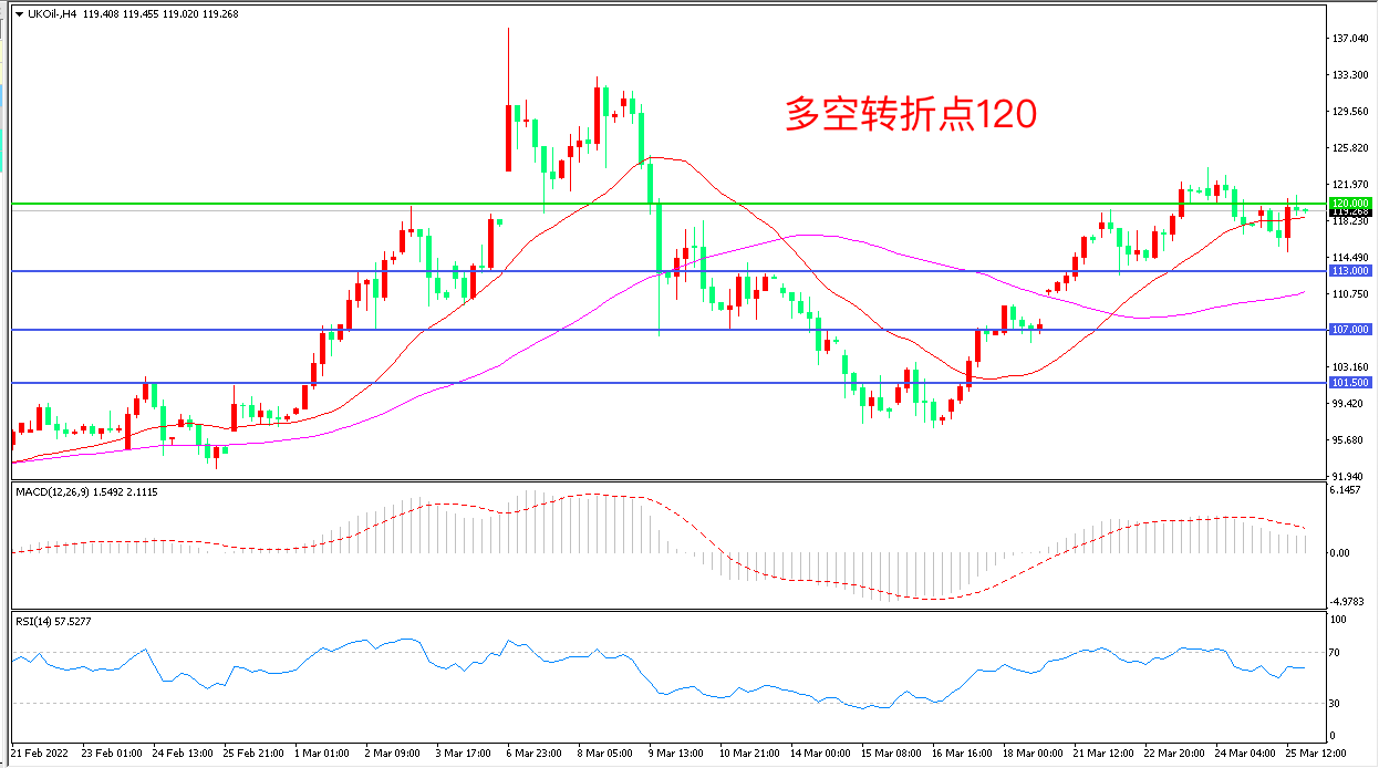 4小时图看,油价围绕120美元附近展开震荡,短线走势偏强,均线系统走平,MACD红柱增加,RSI指标走平,日内震荡上行概率较大。