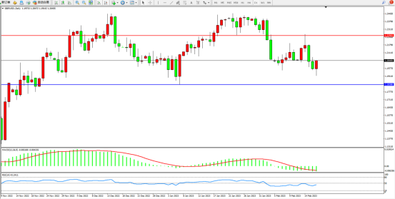 高位空头动力呈阶梯式震荡下移,短期跌势或将延续,市场整体处于偏弱势向下移动,上方压制关注1.22563附近,低位支撑关注1.18380附近,MACD指标处于0轴线下侧弱势整理,RSI指标处于50均衡线下侧弱势徘徊,如图:
