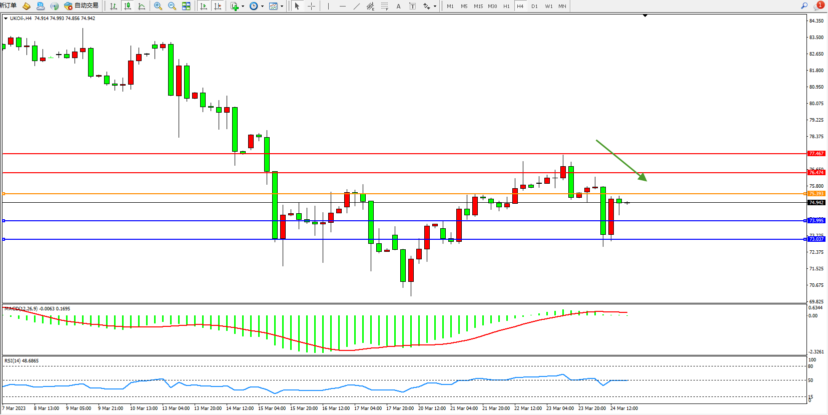 交易策略:75.393下方看跌,目标73.995  73.037