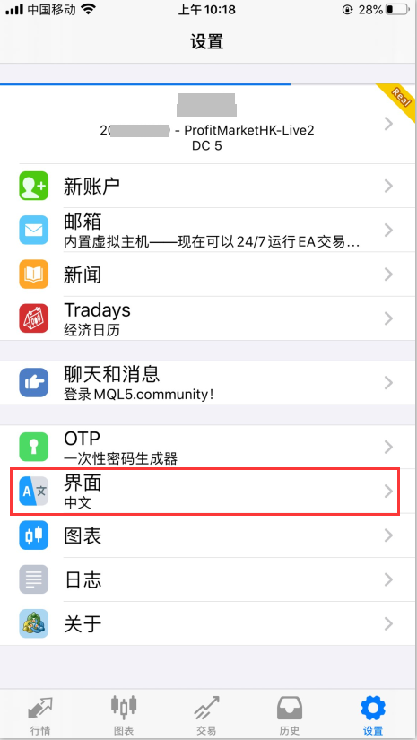 如果打开MT4软件显示乱码或英文,请点击设置→界面,进入页面后设置为简体中文,或设置为您所需使用的语言