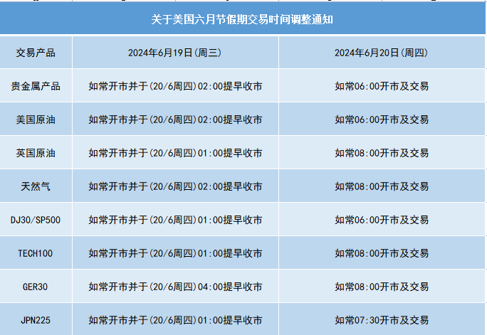 因应2024年6月19日(周三)为美国假期,本公司以下产品的交易时间将于假期期间作以下安排,敬请留意。
